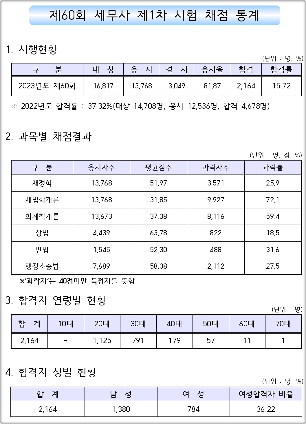 2023년도에 시행된 제60회 세무사 제1차시험 합격통계입니다.