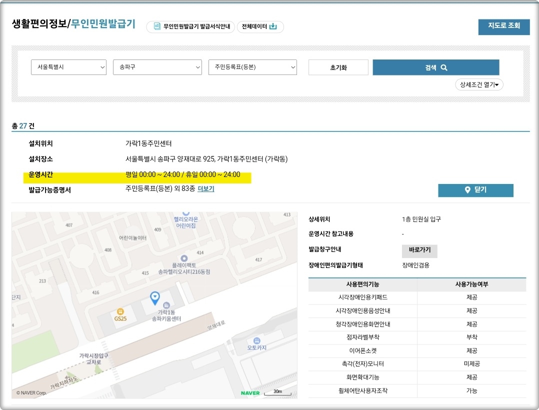 특히 서울 송파구를 기준으로 무인민원발급기를 조회해보니, 설치 장소에 따라 운영시간이 제각각 다르다는 것을 확인할 수 있었는데요.