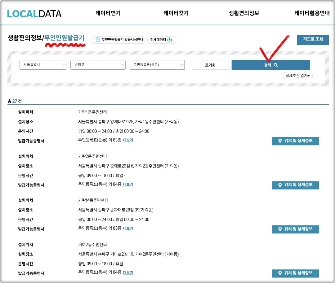 "송파구" 무인발급기 위치는 행정안전부에서 운영하는 '로컬데이터 포털'이 가장 잘 되어 있는 편인데요.