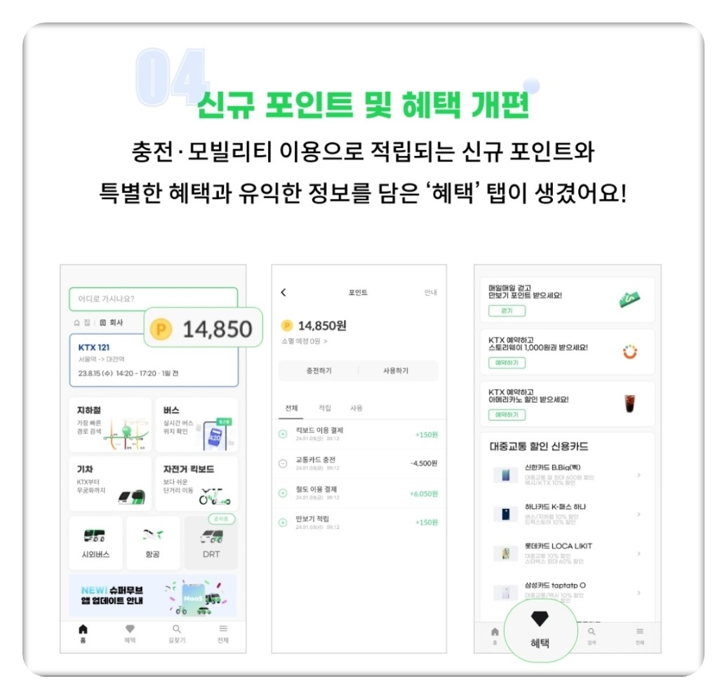 ‘혜택’ 탭에서는 포인트와 사용 내역을 확인할 수 있으며, 각종 할인과 쿠폰 정보를 받아 편리하게 사용할 수 있습니다.