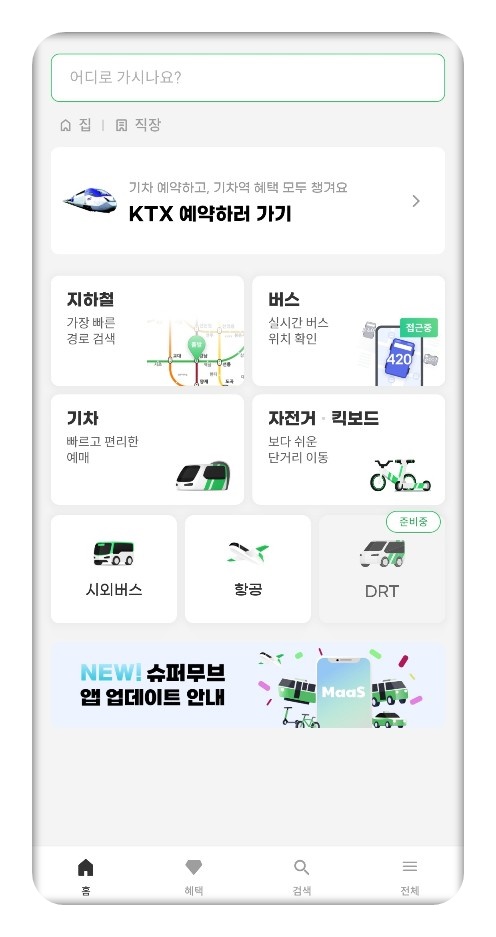 국토교통부에서 다양한 교통수단을 한 번에 확인할 수 있는 '슈퍼무브' 앱을 출시했습니다.