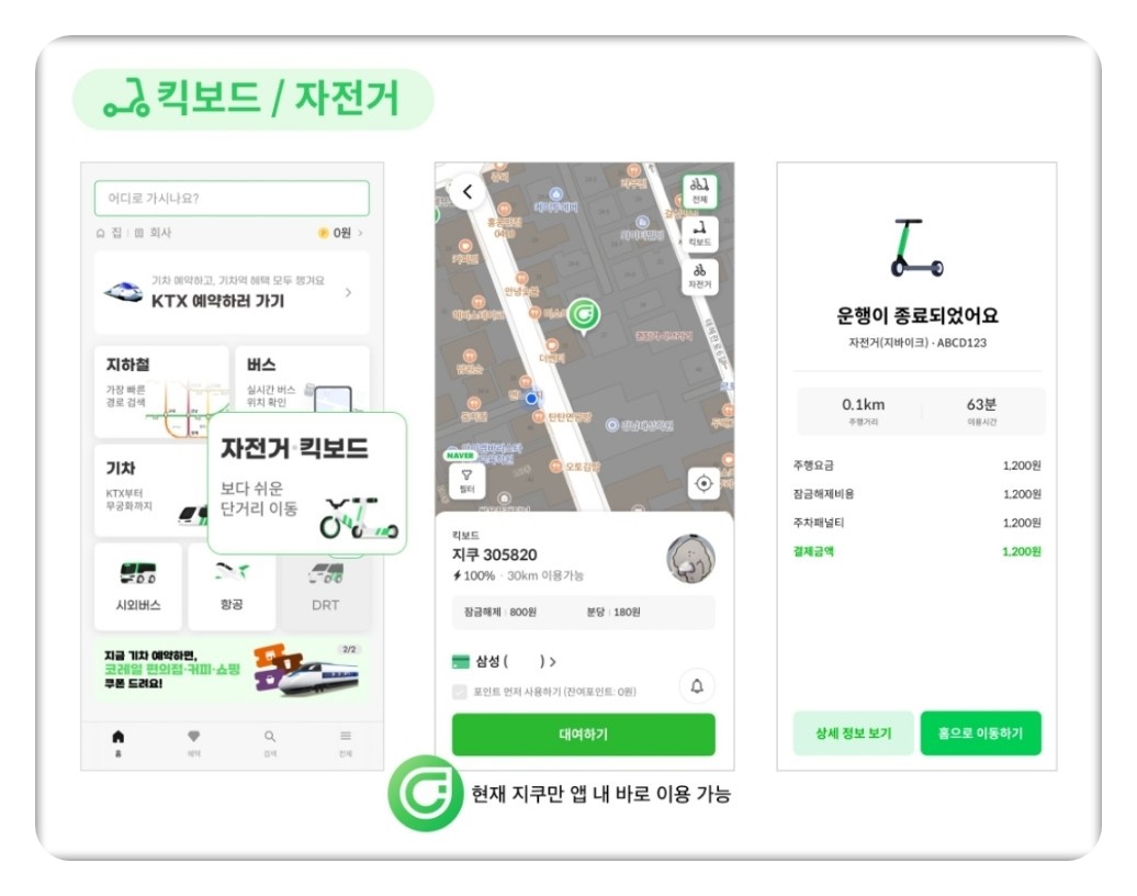 위치 기반으로 사용자가 가까운 곳에서 대여할 수 있는 자전거와 킥보드를 찾아주며, 사용 후 결제 정보도 간편하게 확인할 수 있어 근거리 이동이 편리합니다.