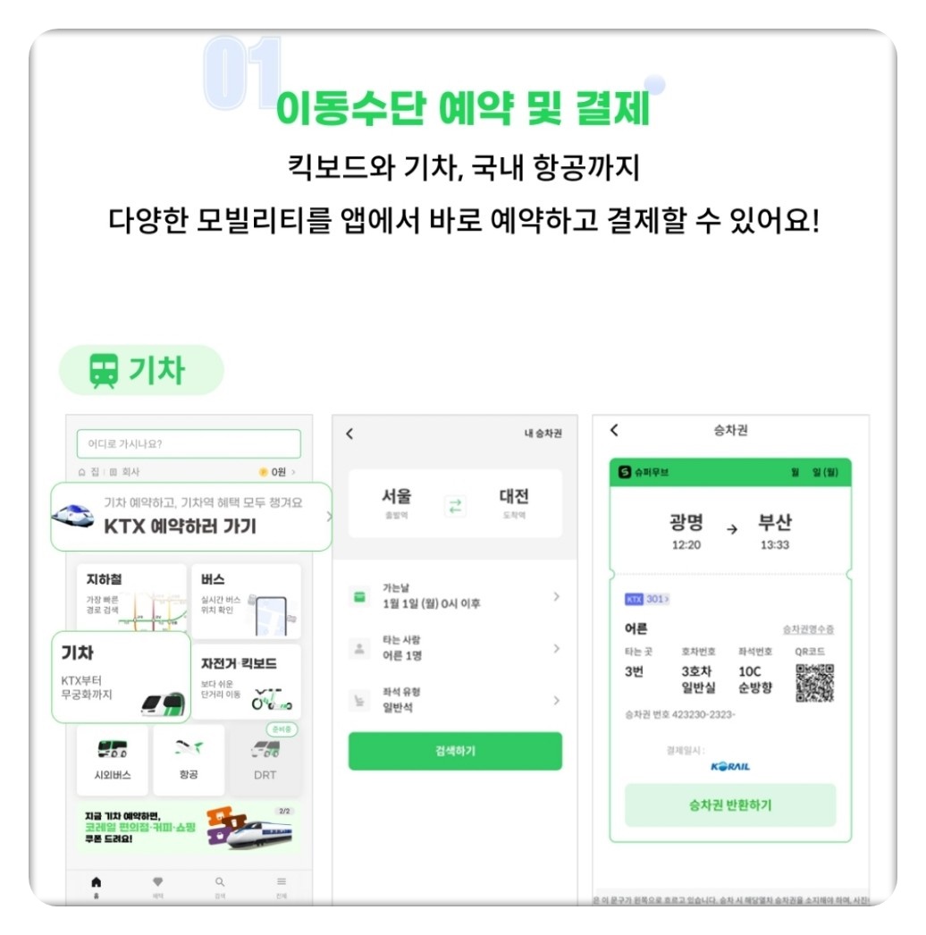 슈퍼무브 앱을 통해 고속버스, 기차, 항공권 등을 한 번에 예약하고 결제할 수 있습니다.
