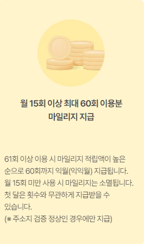 마일리지는 월 61회 이상 이용하더라도 마일리지 적립액이 높은 순으로 60회까지만 적립이 됩니다. 원래는 월15회 미만 사용하면 마일리지 안주는데, 가입 첫 달은 이용횟수가 15회가 안되더라도 마일리지를 지급합니다. 또 대중교통 이용금액의 최대 90%까지 지급받을 수 있어요.