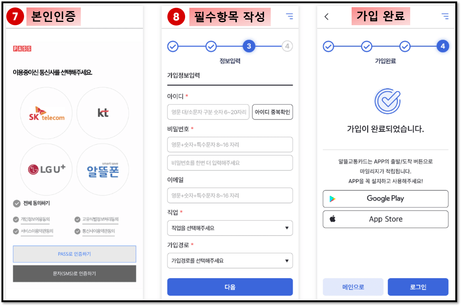 마일리지 적립은 알뜰교통카드 앱 다운로드 및 회원가입이 필수인데요. 알뜰교통카드가 성인을 대상으로 하는 만큼 어플도 만 19세 이상만 회원가입이 가능합니다. 앱 가입하는 방법은 아래의 이미지를 참고하시기 바랍니다.