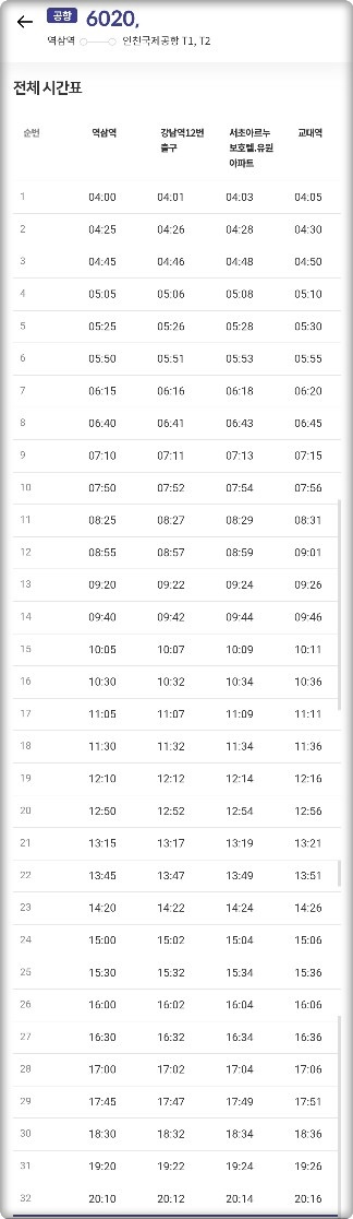 ( 6020 공항버스 '전체정류장' 시간표 )