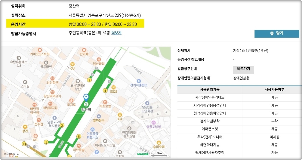 대림역과 여의도역에도 무인민원발급기가 설치돼 있었고, 이용 가능 시간이 비슷하게 운영되고 있으니 참고하시기 바랍니다.