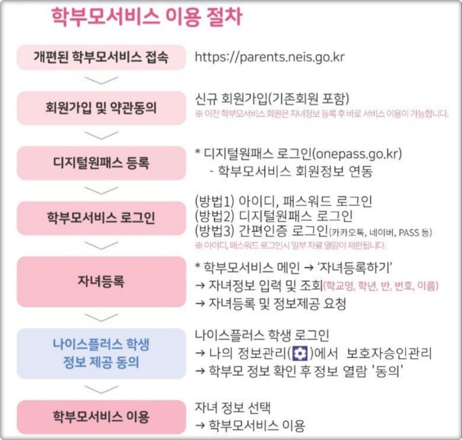 학부모서비스는 자녀의 결석신고서 제출뿐만 아니라 수업 정보와 학교 생활에 대한 다양한 정보를 쉽게 확인할 수 있기 때문에 서비스 이용을 위해서는 필수적으로 거쳐야 하는 절차들이 있습니다.