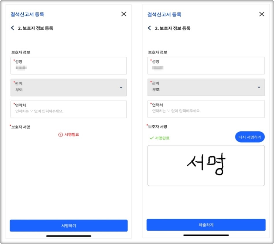 - 보호자 정보와 서명 등록: 보호자의 정보를 입력한 후 서명을 등록합니다.