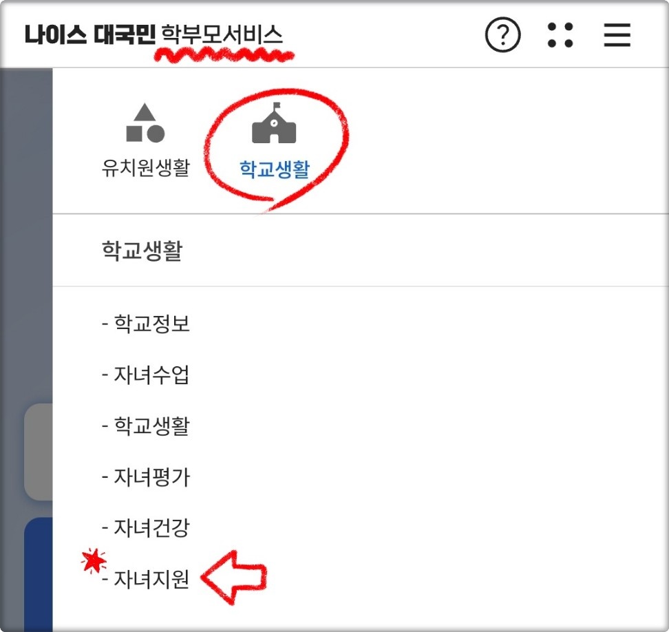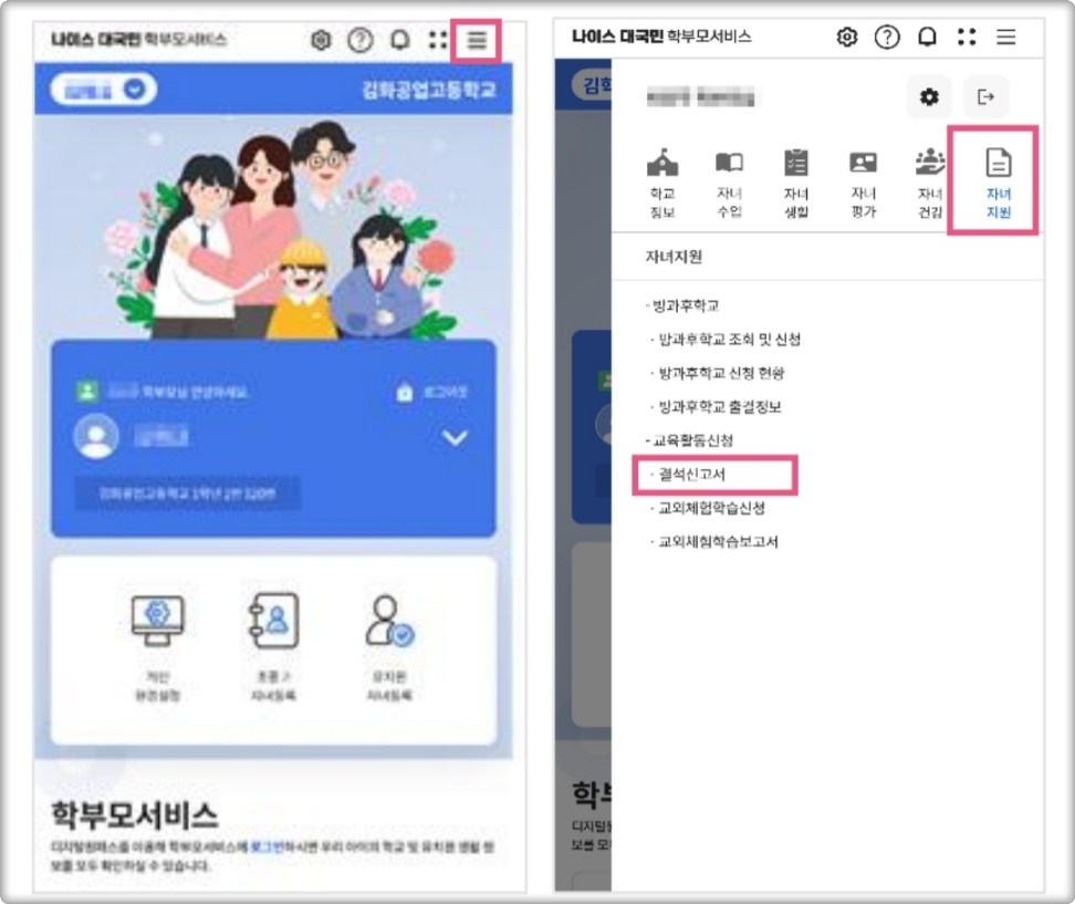 2️⃣ 메뉴 선택: 화면 우측 상단에 있는 메뉴 버튼을 클릭하고, '자녀지원' 항목에서 '결석신고서'를 선택합니다.