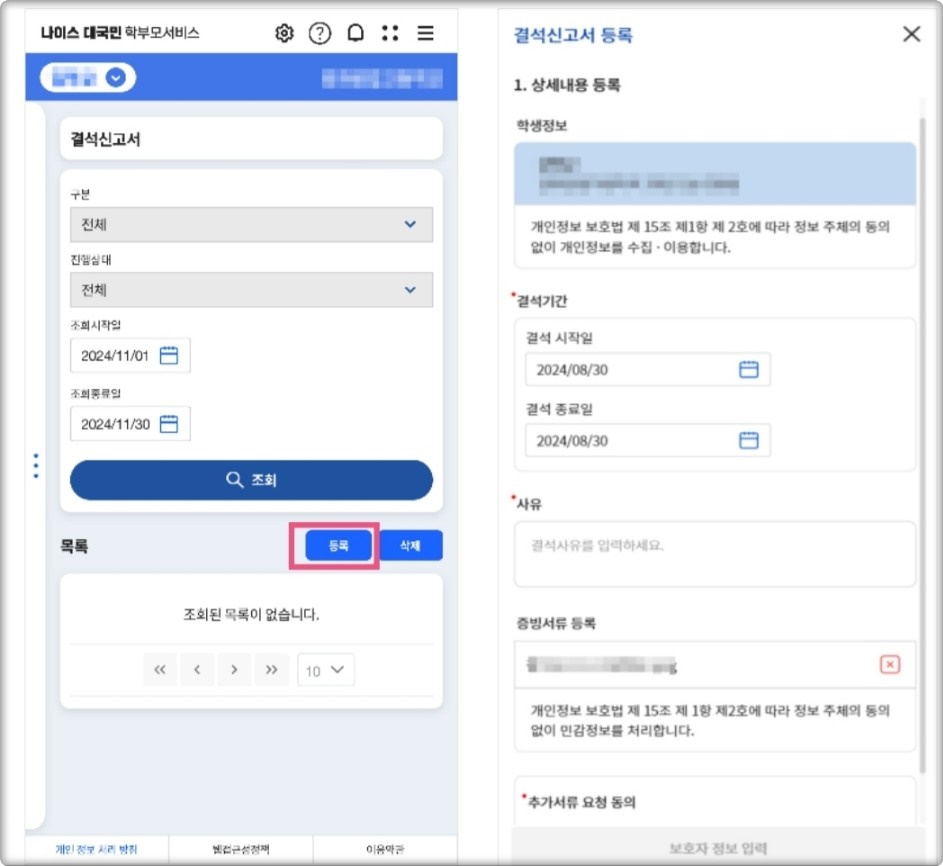 - 결석 기간과 사유 입력: 결석할 기간과 사유를 정확히 입력합니다. 증빙서류가 필요하다면 등록하고, 추가 서류 요청에 대한 동의 여부를 선택합니다.