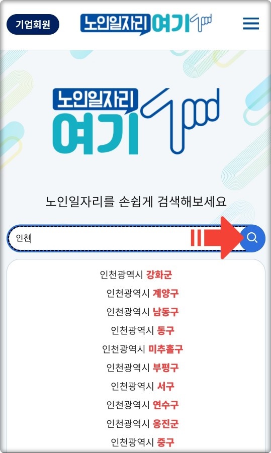 2️⃣ 검색창에 "노인일자리"나 관심 있는 업종의 키워드를 입력한 뒤 검색 버튼을 눌러요.