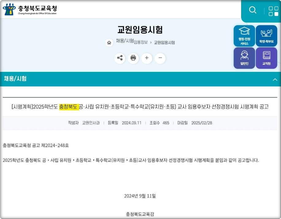 > 2025 충청북도 교육청 초등교원 임용공고 바로가기