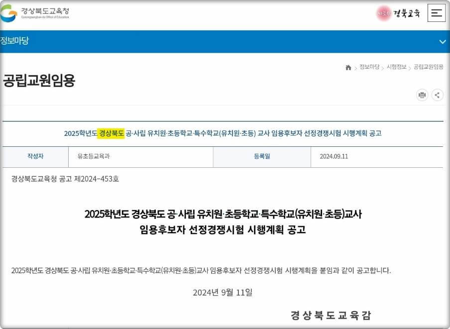 > 2025 경상북도 교육청 초등교원 임용공고 바로가기