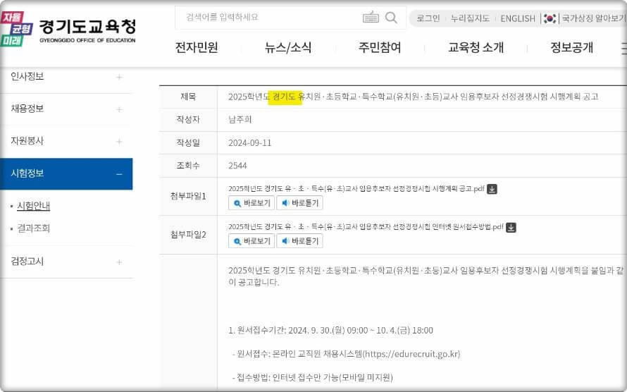 2025학년도 경기도교육청 공립(국·사립) 유치원·초등학교·특수학교(유치원·초등)교사 임용후보자 선정경쟁시험 시행계획 공고문입니다.