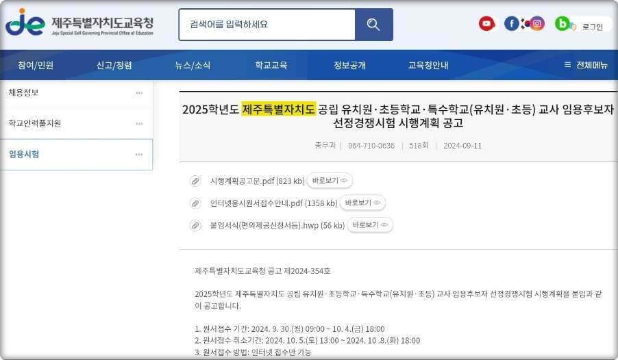 > 2025 제주특별자치도 교육청 초등교원 임용공고 바로가기