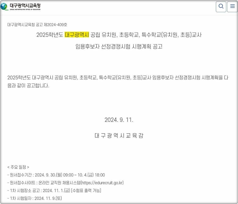 > 2025 대구광역시 교육청 초등교원 임용공고 바로가기