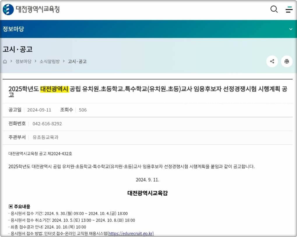 > 2025 대전광역시 교육청 초등교원 임용공고 바로가기