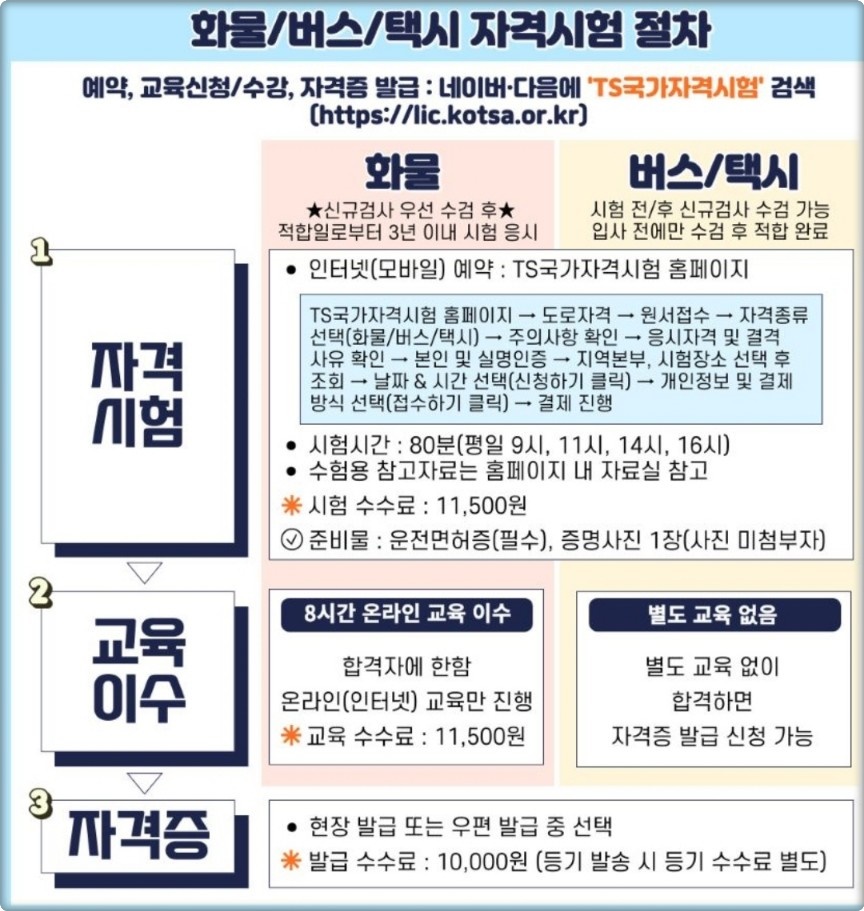 - 시험 과목: 교통 및 운수 관련 법규, 안전운행 요령, 운송 서비스, 지리