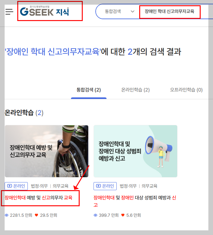 - 검색창에 ‘장애인 학대 신고의무자 교육’이라고 입력하면 두 가지 강좌가 바로 조회됩니다.