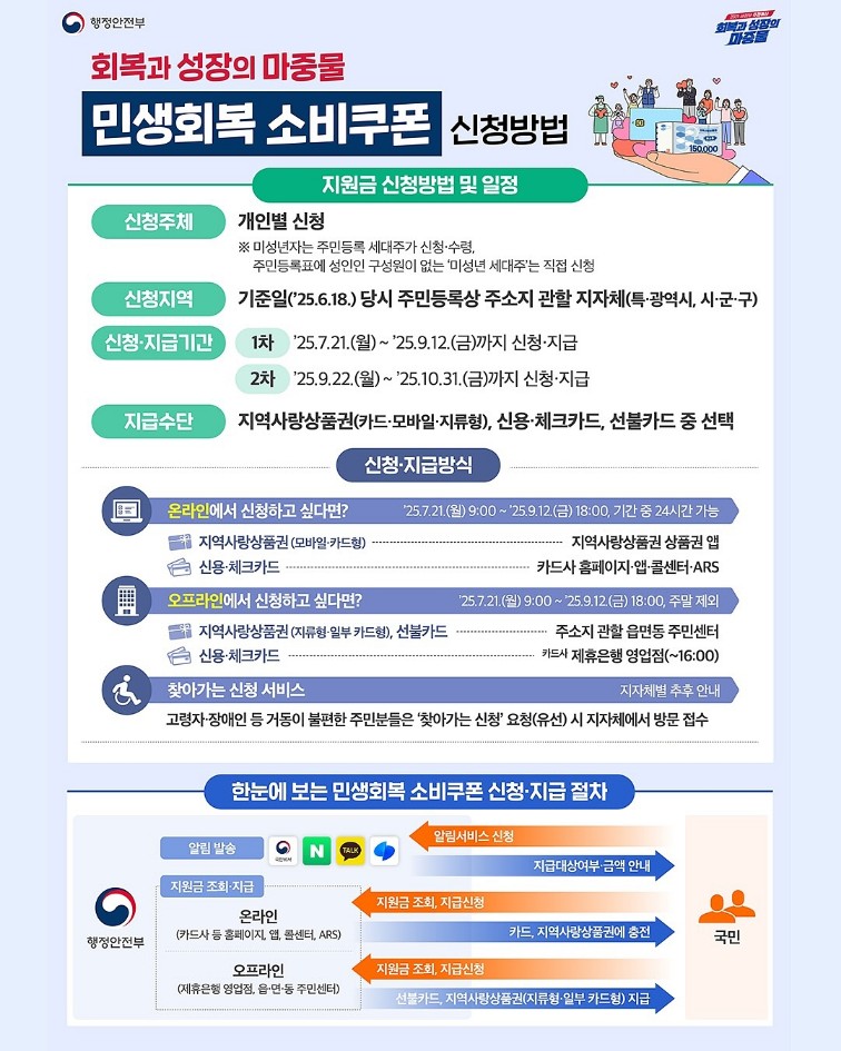 2025 민생회복 소비쿠폰이 7월 21일부터 9월 12일까지 1차 신청, 9월 22일부터 10월 31일까지 2차 신청이 진행됩니다.