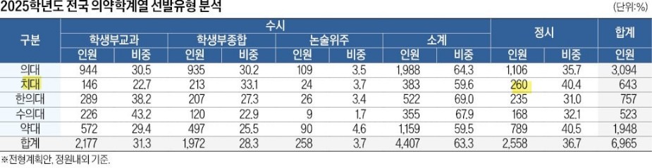 🔻 참고로, 2025학년도에 치대는 총 643명 선발예정이며 그 중 약260명이 정시로 선발됩니다. 다만, 의대 증원이 논의되기 전의 계획된 인원이다보니 앞으로 선발인원이 더 늘어날 여지는 있습니다.