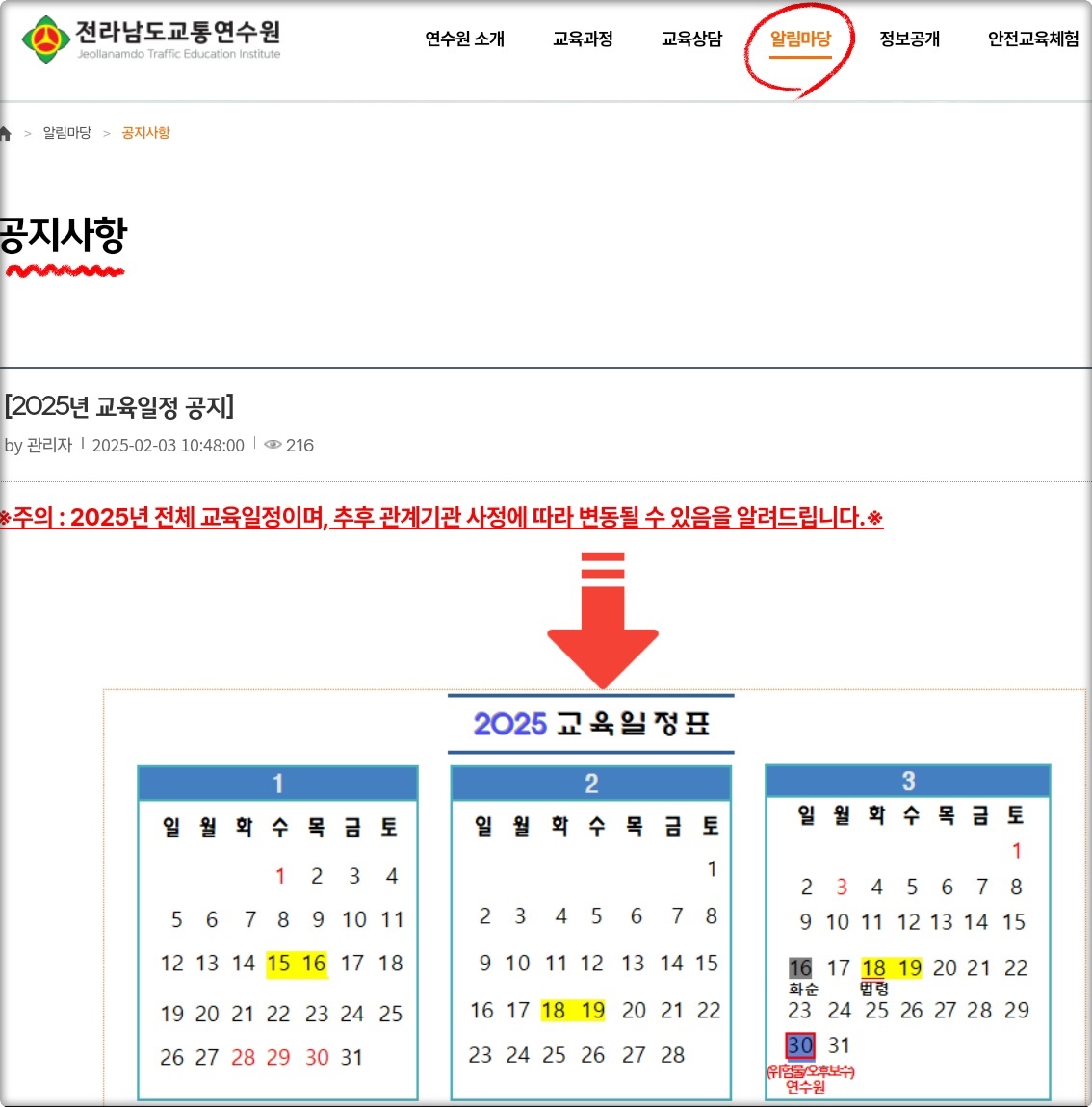 전라남도 교통연수원 홈페이지 공지사항에는 '2025년도 연간 교육일정'이 이미 공지되었는데요.