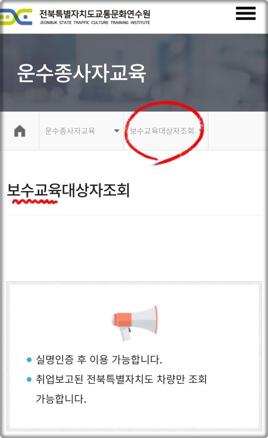 보수교육 대상자 조회서비스는 '전북 교통연수원' 홈페이지에서 제공하고 있습니다.