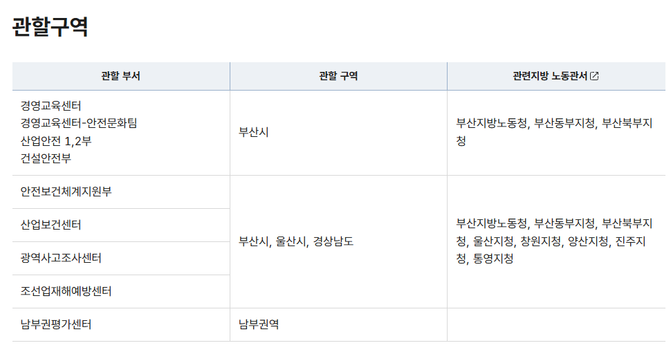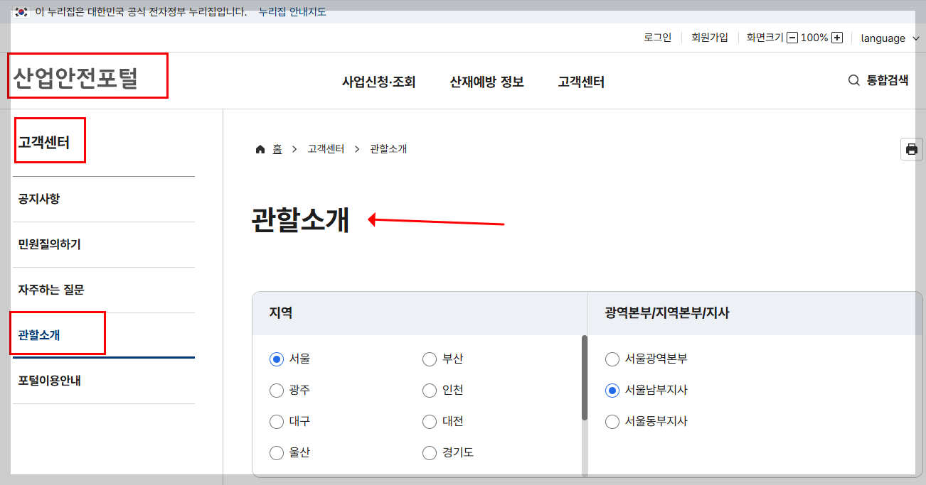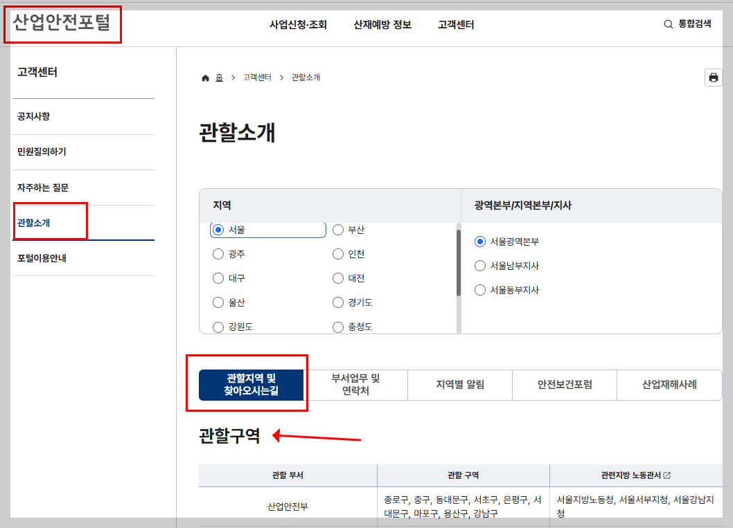 안전보건공단 산업안전포털에 들어가면 상단 메뉴에서 고객센터 → 관할소개로 들어갈 수 있습니다.