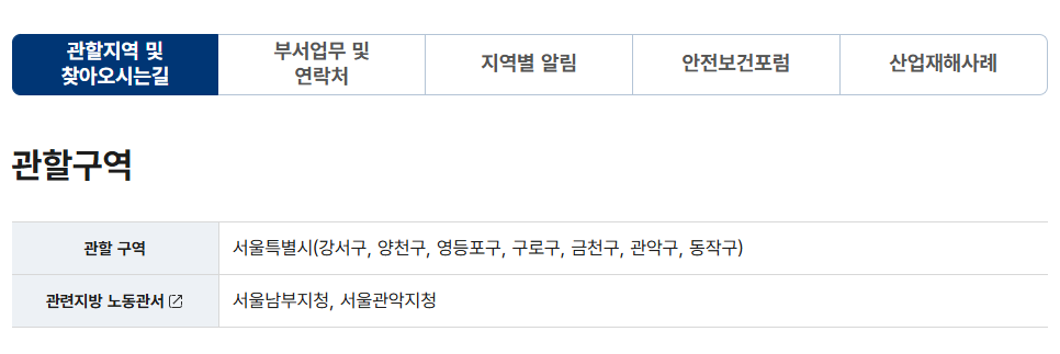 원하는 지사를 클릭하면, 관할 구역과 관련 지방노동관서, 그리고 ‘찾아오시는 길’까지 확인할 수 있습니다.