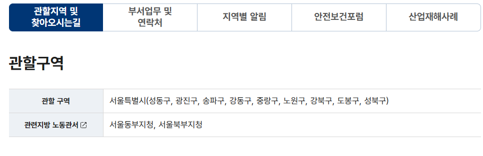 여기서 서울광역본부를 클릭하면, 종로·중구·서초·강남 등 구체적인 관할구역과 함께 관련 지방노동청까지 연결 정보가 제공됩니다.