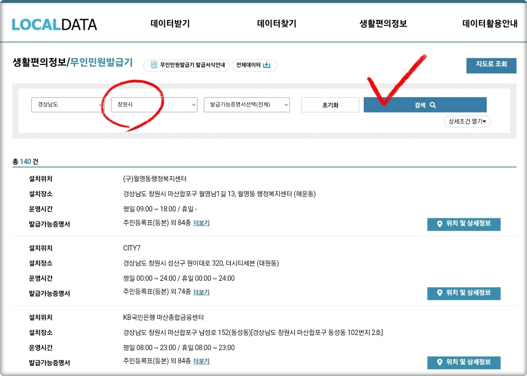 "창원시" 무인발급기 위치는 행정안전부에서 운영하는 '로컬데이터 포털'이 가장 잘 되어 있는 편인데요.