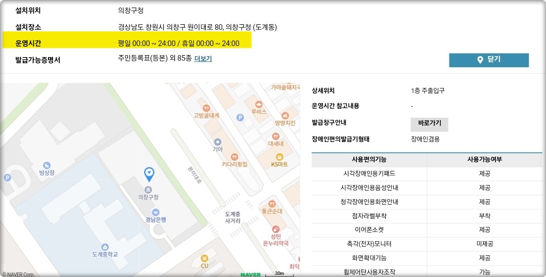 특히 창원시를 기준으로 무인민원발급기를 조회해보니, 설치 장소에 따라 운영시간이 제각각 다르다는 것을 확인할 수 있었는데요.