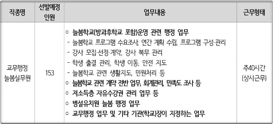 늘봄실무원은 교무행정 및 기타 관련 업무를 담당하며 근무일 및 출퇴근 시간은 근무하는 기관(학교)의 운영 여건에 따라 유동적일 수 있습니다.