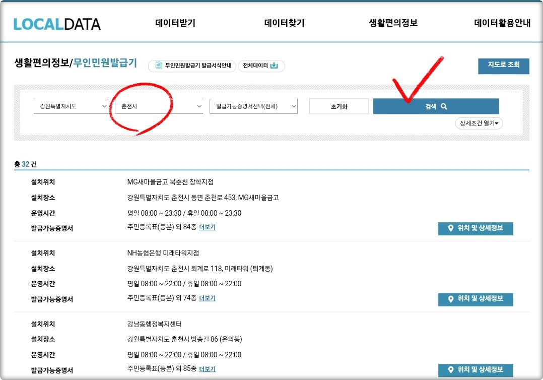 "춘천시" 무인발급기 위치는 행정안전부에서 운영하는 '로컬데이터 포털'이 가장 잘 되어 있는 편인데요.