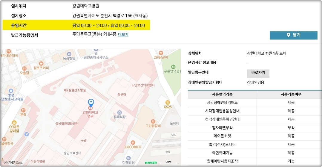 특히 강원 춘천시를 기준으로 무인민원발급기를 조회해보니, 설치 장소에 따라 운영시간이 제각각 다르다는 것을 확인할 수 있었는데요.