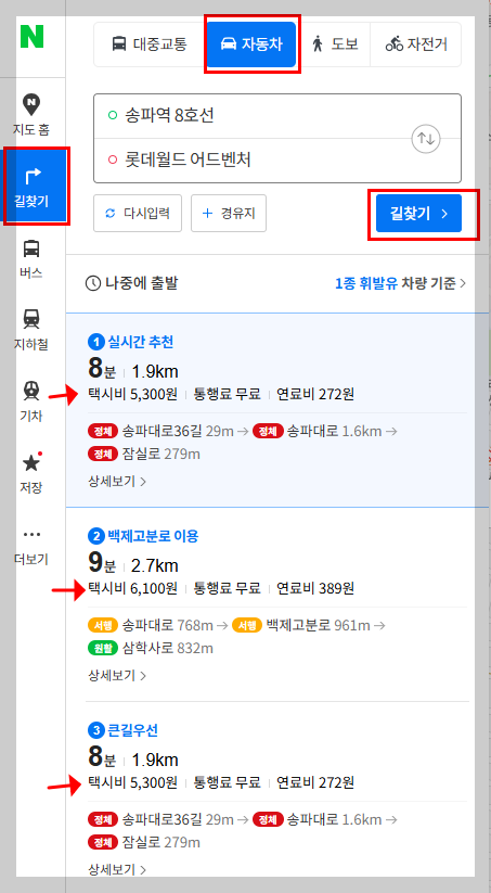이동 수단 탭 중에 ‘자동차’를 꼭 선택해야 택시비 계산기 기능이 함께 작동합니다.