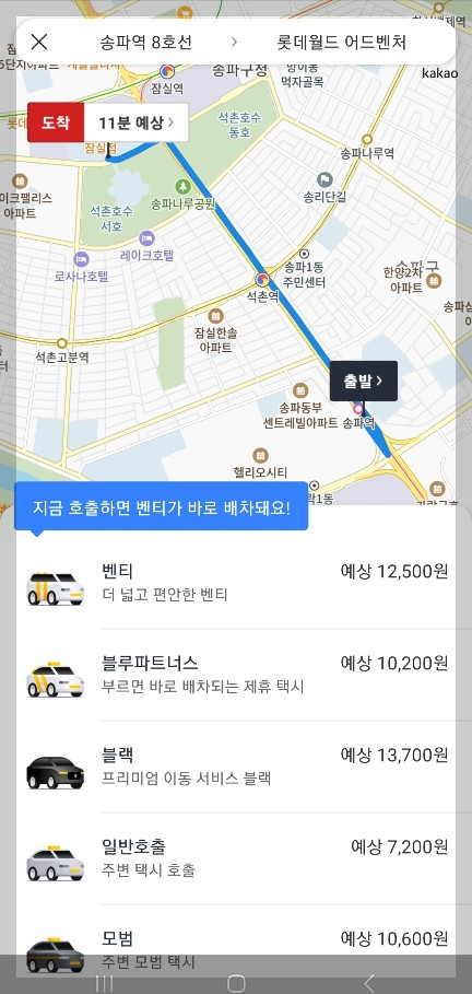 카카오T 택시비 계산기는 보다 상세한 요금 예측과 차량 선택 기능까지 제공하는데요.