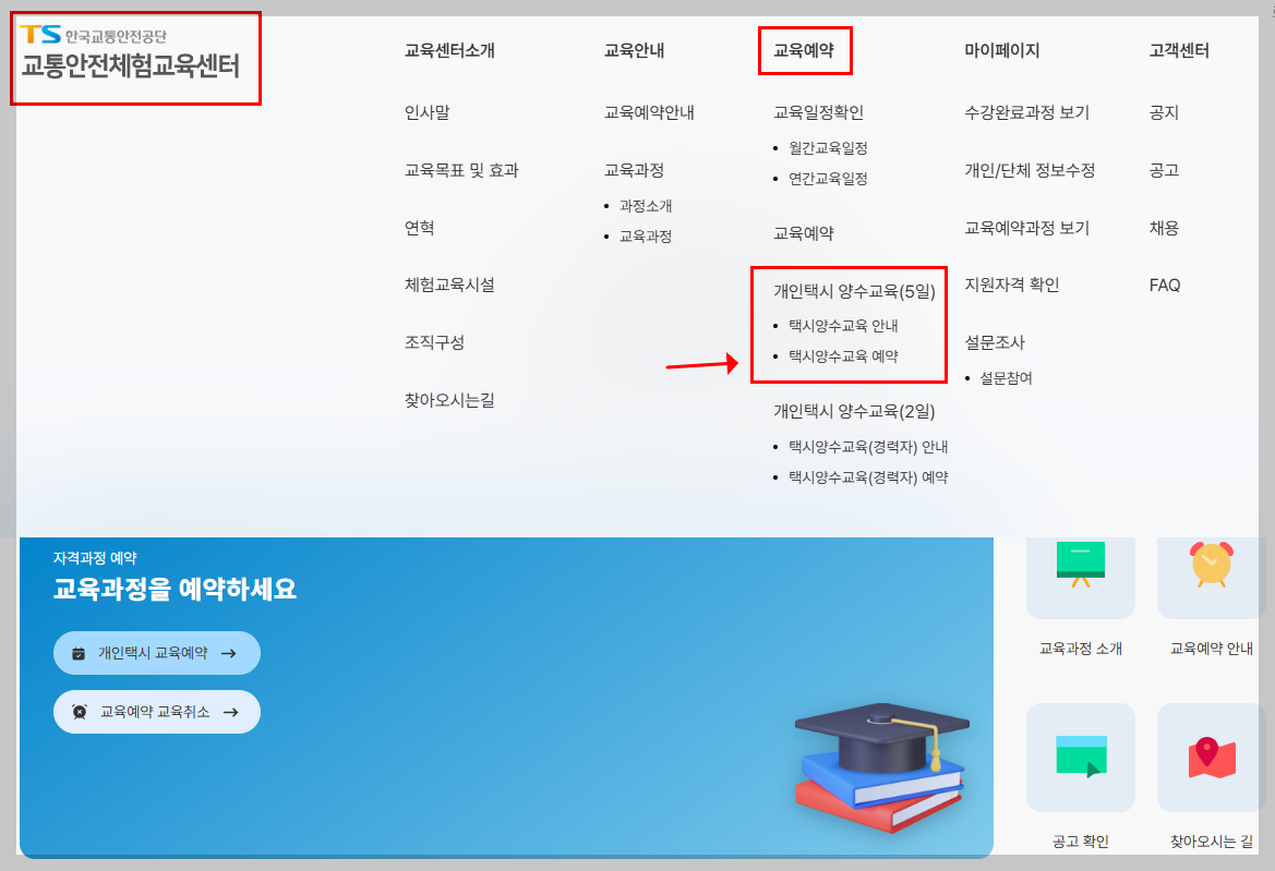 택시 양수교육 신청은 다른 교육처럼 도로교통공단이나 TS자격시험 사이트에서 하는 것이 아니라, ‘교통안전체험교육센터’ 홈페이지에서만 신청이 가능합니다.