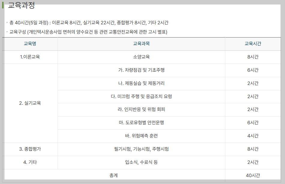 • 이론교육(8시간): 소양교육 중심으로 진행되며, 택시 운송업에 대한 기본 이해를 돕습니다.