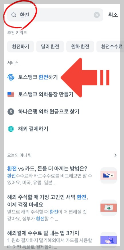 - 상단의 돋보기 아이콘(검색) 을 눌러 "환전" 을 검색합니다.