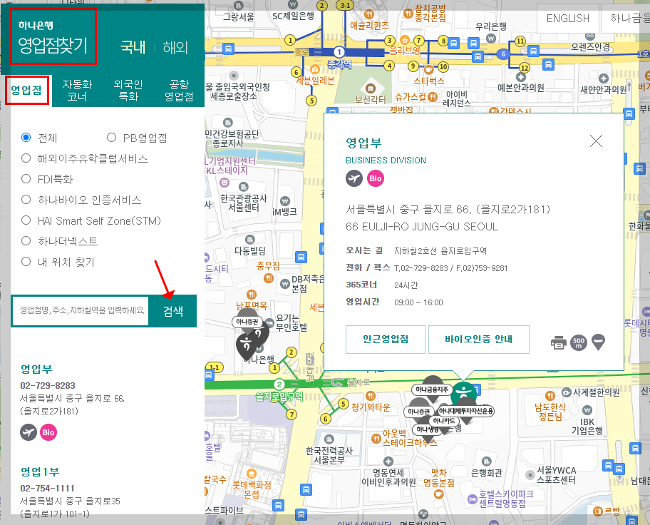(하나은행 전국 영업점 찾기)