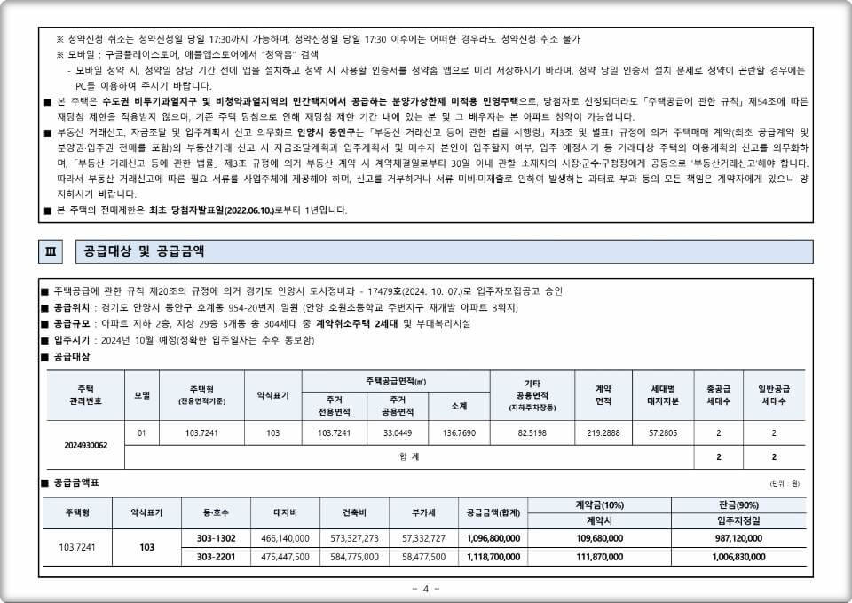 이번에 나오는 계약 취소 주택은 103㎡형 두 가구로, 2022년 분양가 그대로 제공됩니다.