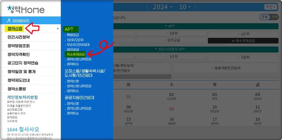 - 로그인 후, 청약신청 → APT → 취소후재공급 메뉴로 이동하여, 원하는 주택형 및 주택명을 선택합니다.