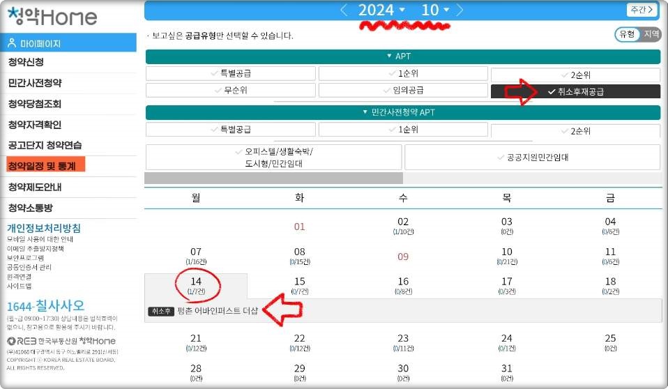 - 로그인 후, 청약신청 → APT → 취소후재공급 메뉴로 이동하여, 원하는 주택형 및 주택명을 선택합니다.