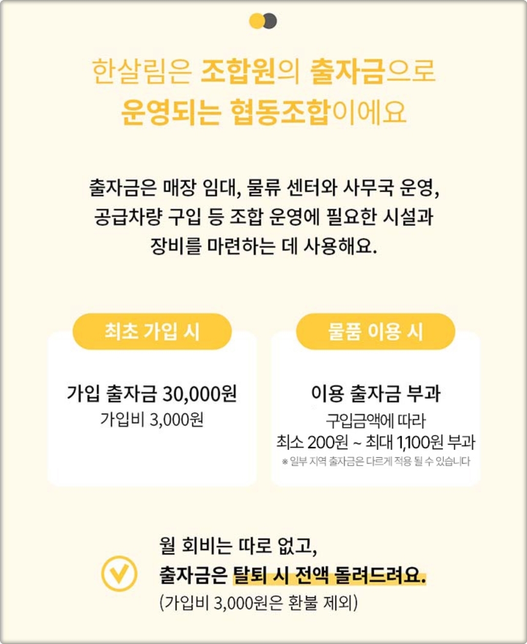 위와 같이 한살림에서 조합원가로 구매하려면 출자금 3만 원과 가입비 3천 원, 총 33,000원을 1번만 내면 돼요.