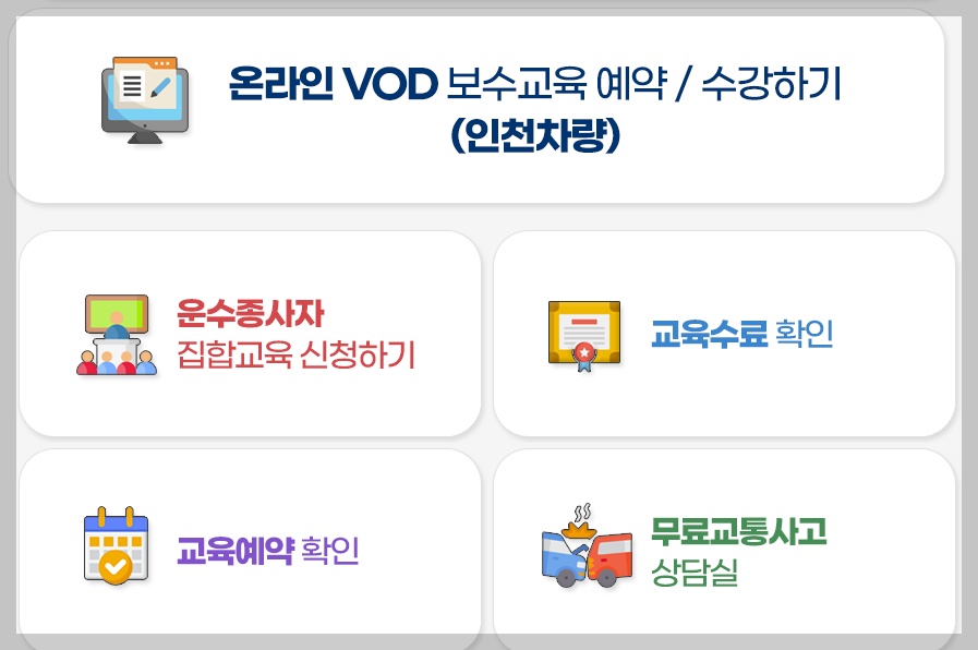 요즘은 온라인으로 보수교육을 들을 수 있는 지역이 점점 늘어나고 있습니다만, 모든 지역에서 가능한 건 아니기 때문에 본인 차량이 등록된 지역 [교통연수원 홈페이지]를 먼저 확인하시는 게 가장 확실합니다.