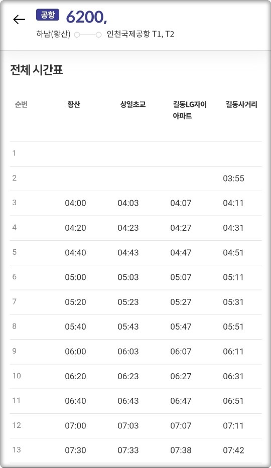 ( 6200 공항버스 '전체정류장' 시간표 )