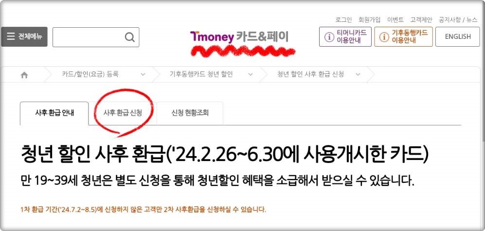 : 기후동행카드 청년 할인 사후 환급 신청은 티머니 카드&페이 홈페이지를 통해 가능합니다.