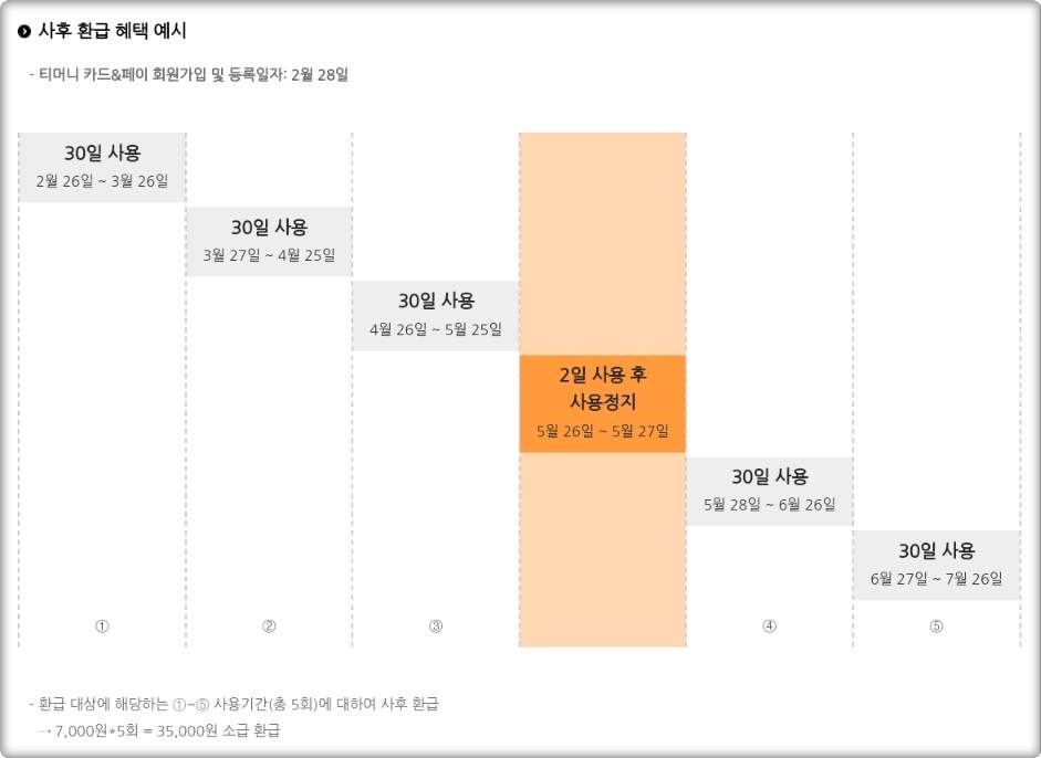 사후환급을 받으려면 사용 기간 중 티머니 카드&페이 홈페이지에 회원 가입하고 카드를 등록해야 합니다. 중도에 카드가 삭제될 경우, 환급 대상에서 제외될 수 있으니 주의하세요.